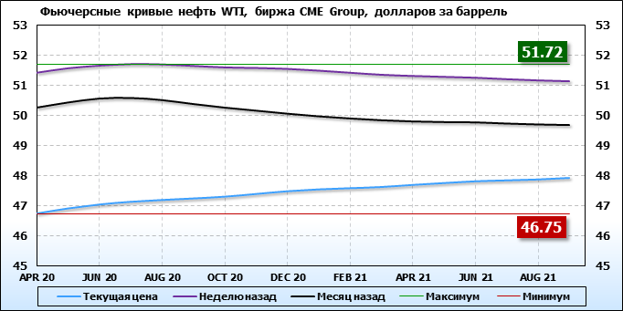 На 02.03.20 стоимость нефти марки WTI на бирже CME Group по контракту APR 20 составила 46.75 долларов за баррель. За прошедшую неделю стоимость нефти марки WTI упала на 4.68 $/баррель. Как мы видим на графике, фьючерсная кривая на всем своем протяжении находится в состоянии контанго. Трейдеры не предполагают превышения предложения над спросом при сохранении текущих цен.