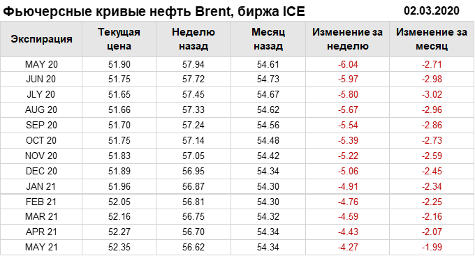 Нефть. Фьючерсные кривые на 2 марта 2020