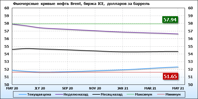 На 02.03.20 стоимость нефти марки Brent на бирже ICE по контракту MAY 20 составила 51.9 доллара за баррель. За прошедшую неделю стоимость нефти марки Brent упала на 6.04 $/баррель. Как мы видим на графике, фьючерсная кривая имеет периоды, когда более дальний фьючерс дешевле ближнего. Состояние бэквардации наблюдаем на следующих контрактах: JUN 20; JLY 20. Таким образом, трейдеры предполагают, что возможно превалирование предложения над спросом в указанные периоды, если рынок будет находиться на данных ценовых уровнях.