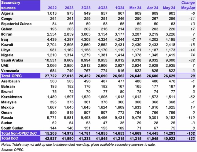 По данным вторичных источников, общий объем добычи сырой нефти ОПЕК-12 в мае 2024 года составил в среднем 26,63 млн баррелей в сутки, что на 29 тыс. баррелей в сутки выше по сравнению с предыдущим месяцем. Добыча сырой нефти увеличилась в основном в Нигерии, Габоне и Экваториальной Гвинее, тогда как добыча в Саудовской Аравии, Кувейте, Ливии и Конго снизилась.
